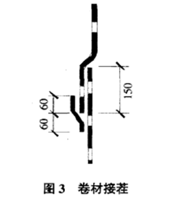 根據國家規范GB 50208-2002《地下防水工程質量驗收規范》,底板預留的甩茬卷材與外墻的卷材搭接接茬寬度不小于150mm,為了在接茬部位將安全保險系數提到最大,在最外層卷材接茬部位再增加一蓋口條,蓋口條卷材與大面卷材同材質,同規格,寬120 mm,見圖3。